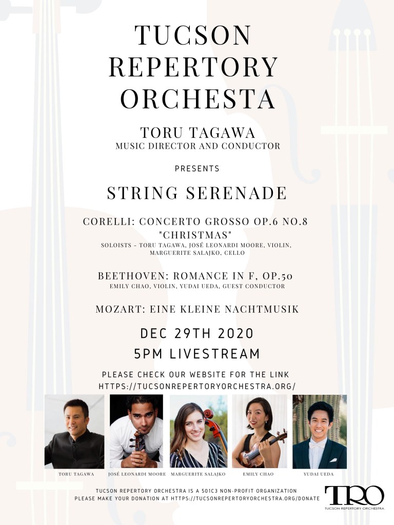 Toru Tagawa, Music Director and Conductor of the Tucson Repertory Orchestra, is proud to present the program, “String Serenade,” on 12/29/20 at 5pm. This 40-minute special performance will be streamed via Youtube and Facebook through Catalyst Arts and Maker Space by SAACA. Due to COVID-19, only a selected number of the players will perform this concert, and everyone will be socially distanced and wearing a mask. As TRO musicians have not met since early March 2020, we are very excited about finally performing together again.