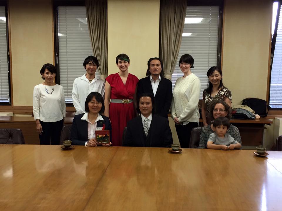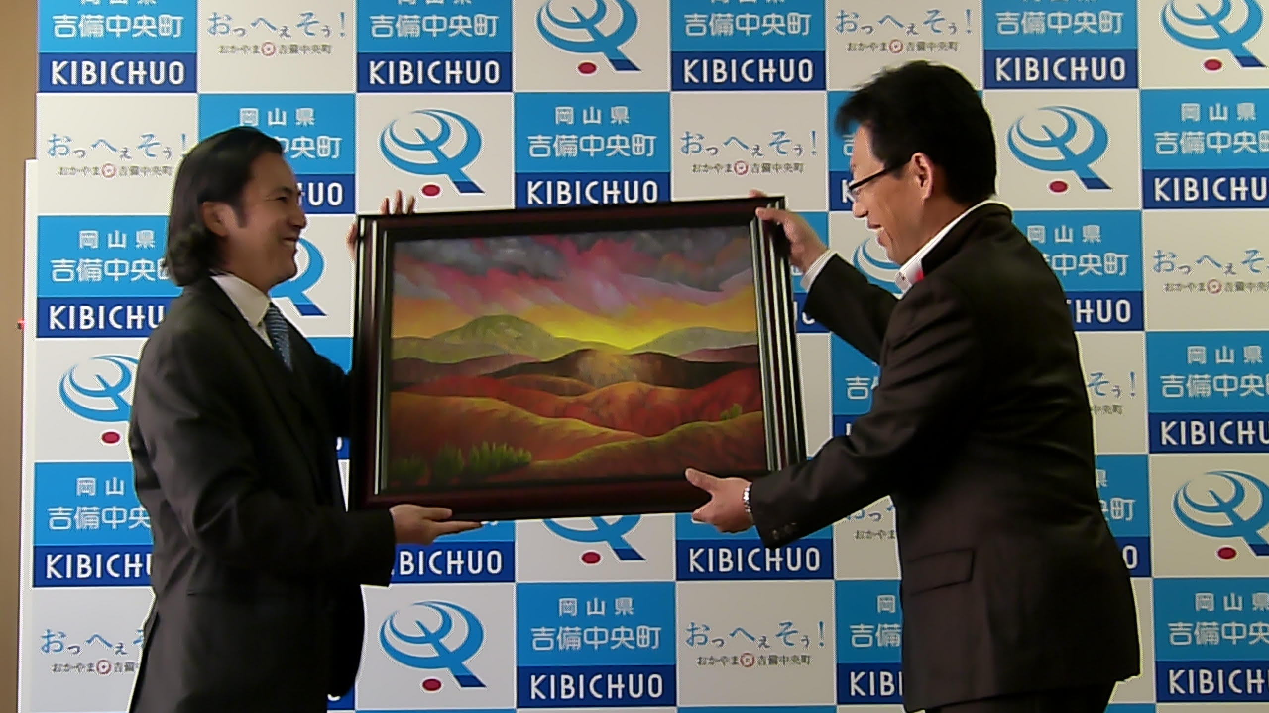 Meeting Town Mayor of Kibichuo Cho, Masanori Yamamoto, presening Painting by Nancy Monsman, titled “Desert Rain”